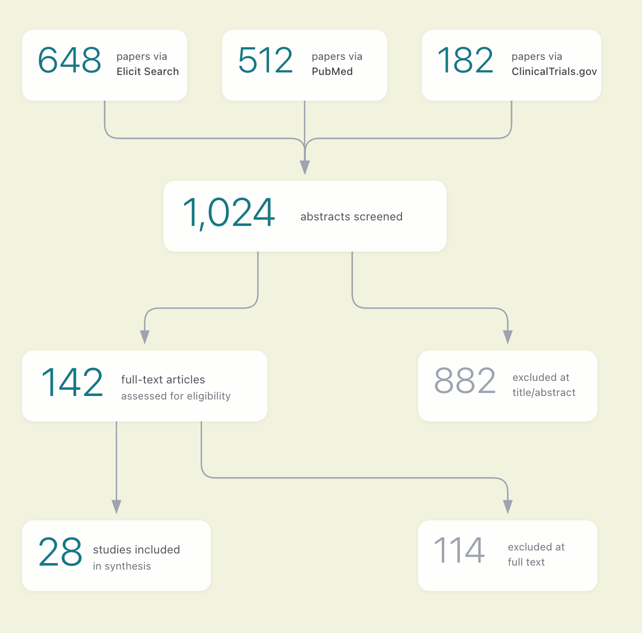 Combined with full-text screening and strict criteria, Elicit now supports the core PRISMA workflow from search through extraction.