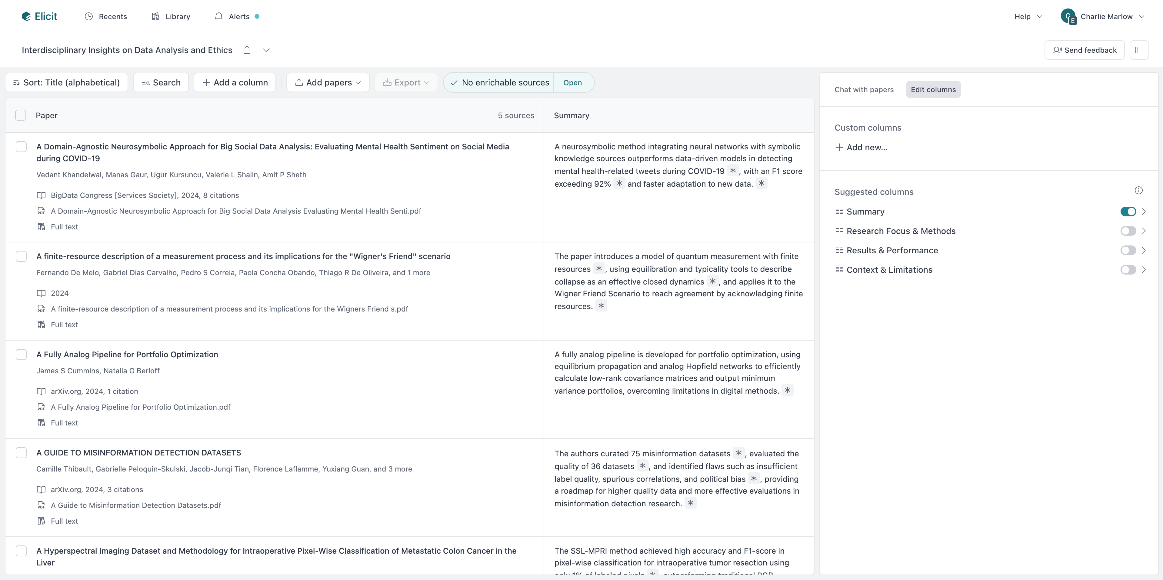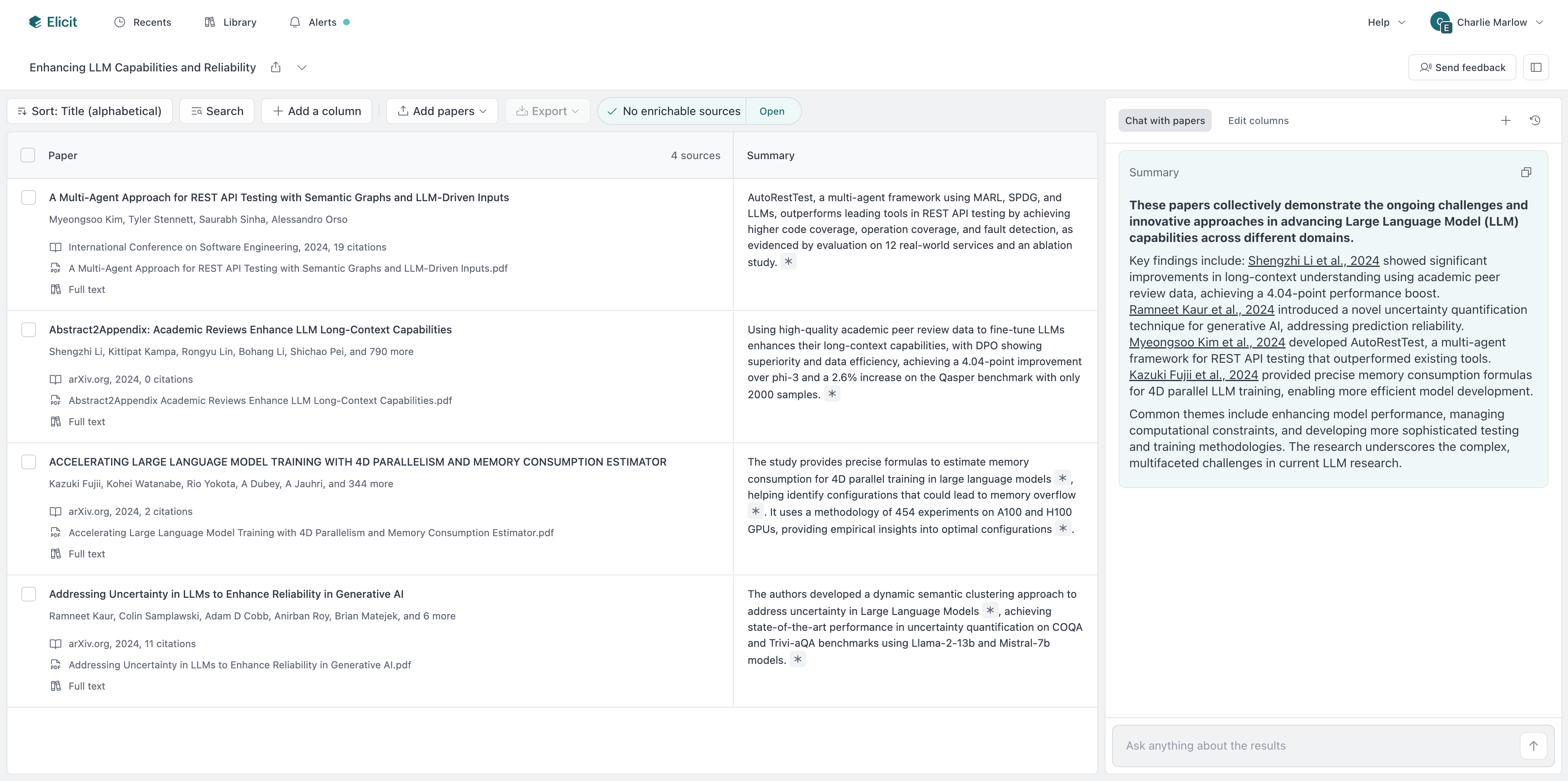 When you start a session, Elicit automatically summarizes each paper and kicks off the conversation with an initial message, useful context before you've even asked a question. You can also add papers mid-conversation without starting over.