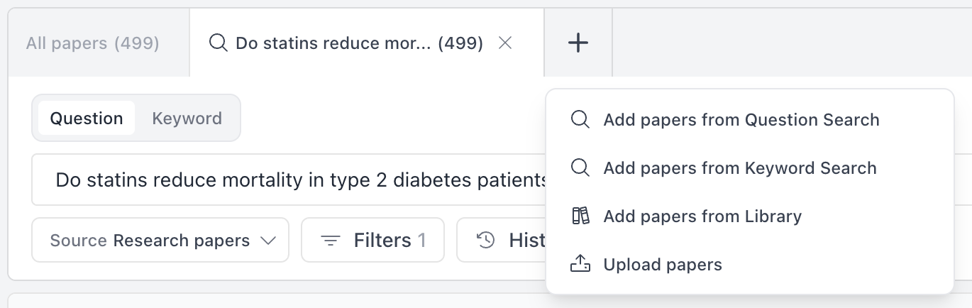 To try multi-tab search: open any Systematic Review and click the + icon in the Paper sources bar. Learn more