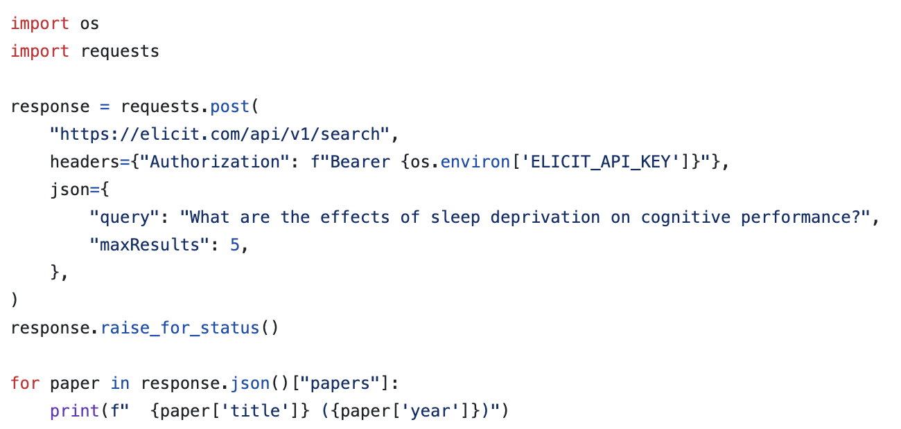 Check out more code examples at https://github.com/elicit/api-examples. API reference and information on authentication, billing, and rate limits are available at docs.elicit.com.