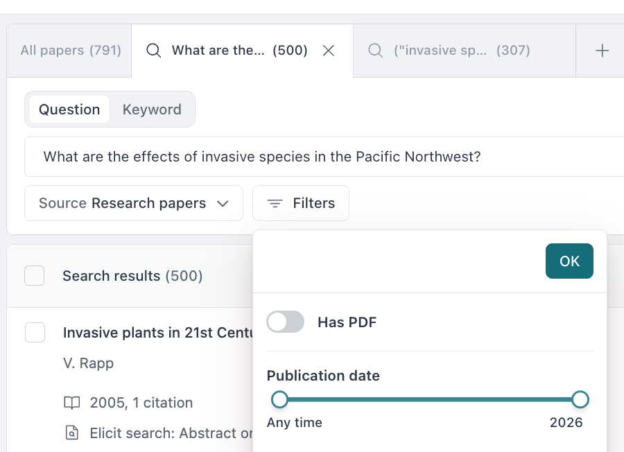 Combining criteria: You can mix and match in a single query — Elicit will pick up multiple filter criteria at once: