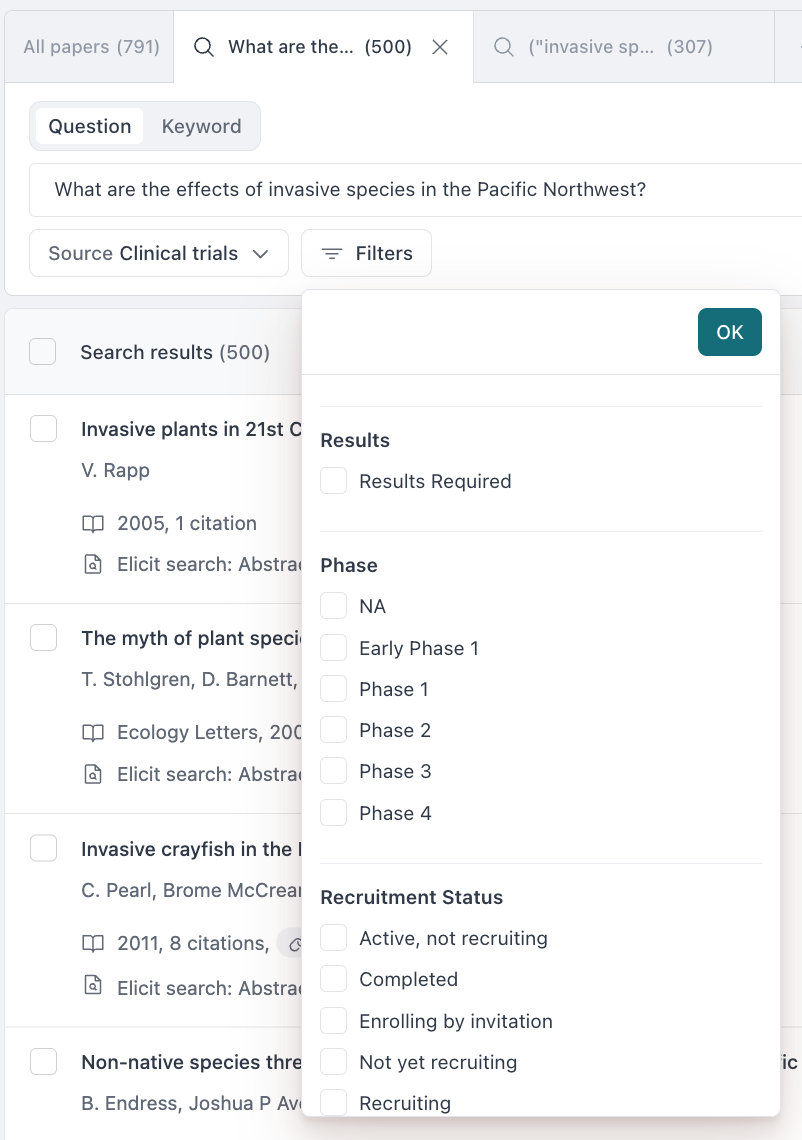 Elicit can search clinical trial registrations in addition to research papers. Clinical trials have their own set of filters.