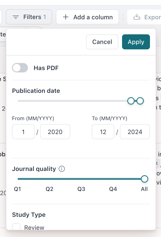 Click the Filter button at the top of the Find Papers table or in the Systematic Review workflow to access filter controls in the UI. These can be used alongside natural language filters or on their own.