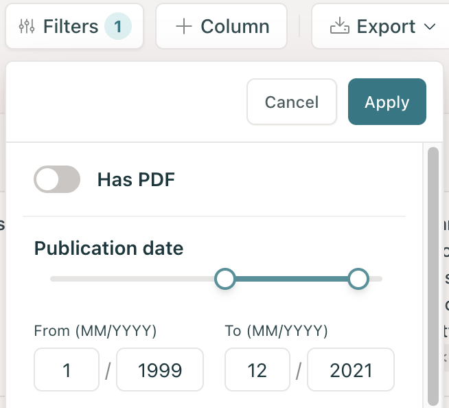 When using the Find Papers workflow, papers can be filtered by the year of publication.