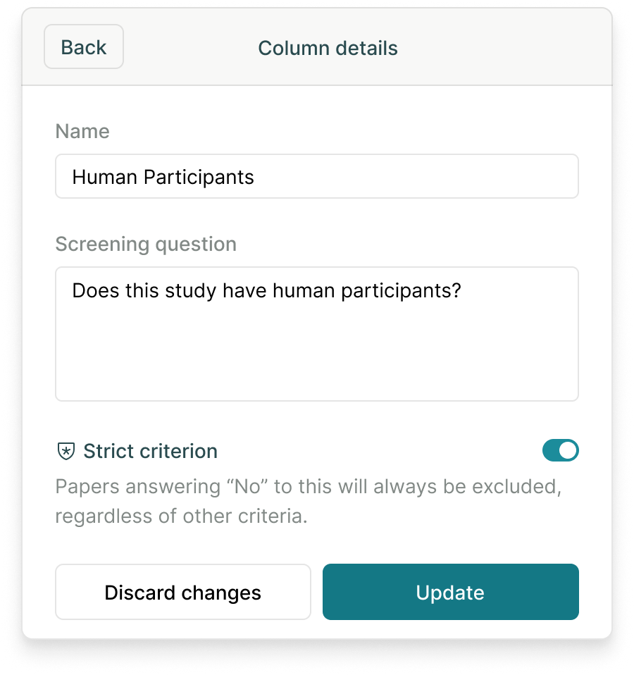 By default, screening criteria are not 'strict' and Elicit will make a holistic decision to include/exclude a paper based on all the criteria. However, you can toggle any number of criteria to be strict so that any papers failing those criteria are automatically excluded. To do this, click on a screening column and hit the 'Strict criterion' toggle for it.