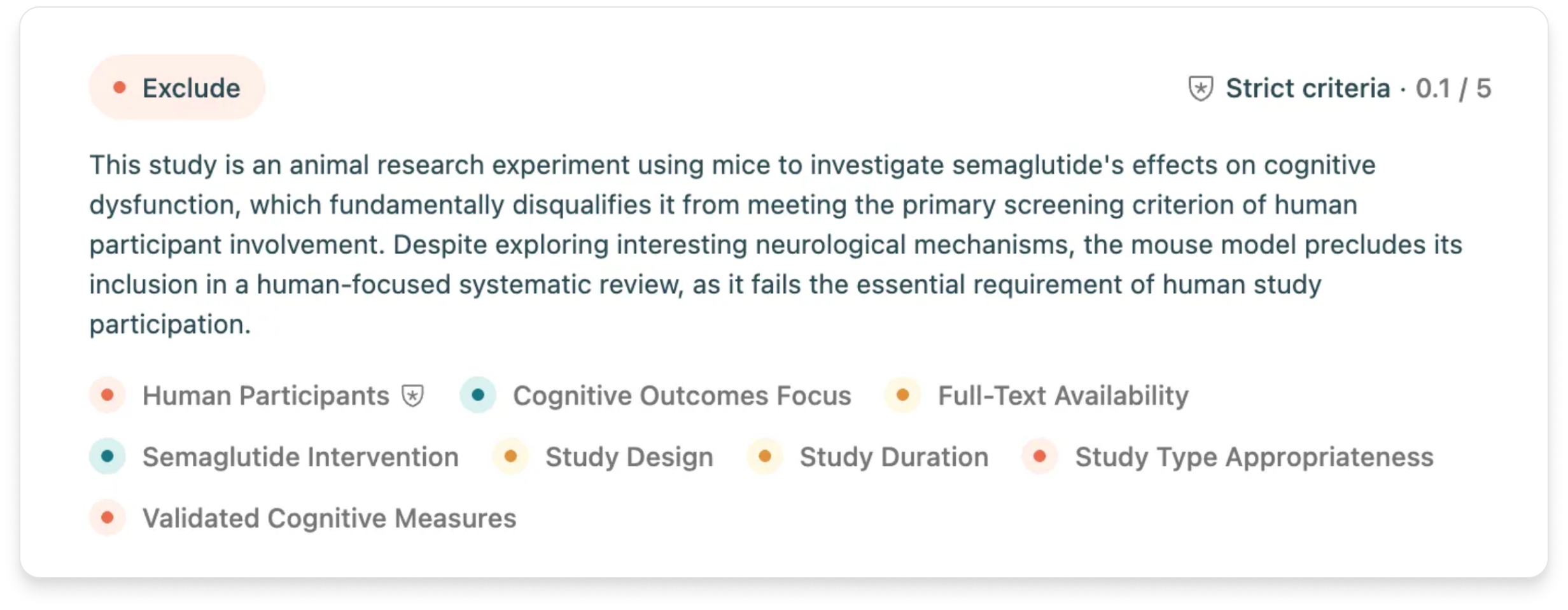 If you have any strict criteria, any papers failing those criteria will be excluded automatically and will be listed at the bottom of the results page. They will have a label indicating they were excluded because they failed to meet one of your strict criteria.