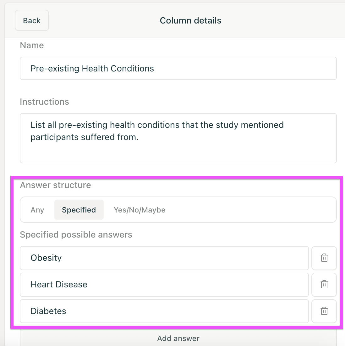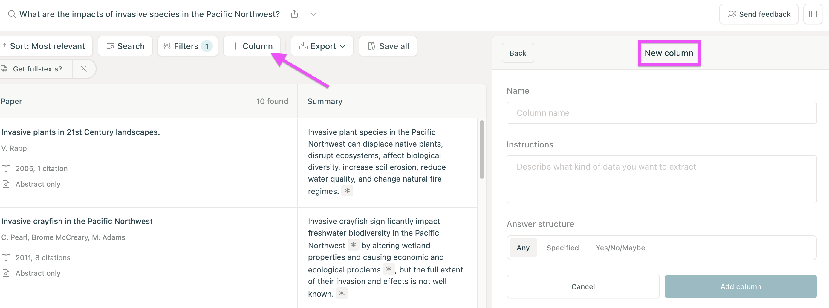 Create a column for each data point you'd like to extract from your papers. Columns can pull data from the papers' body text or from tables in the papers.