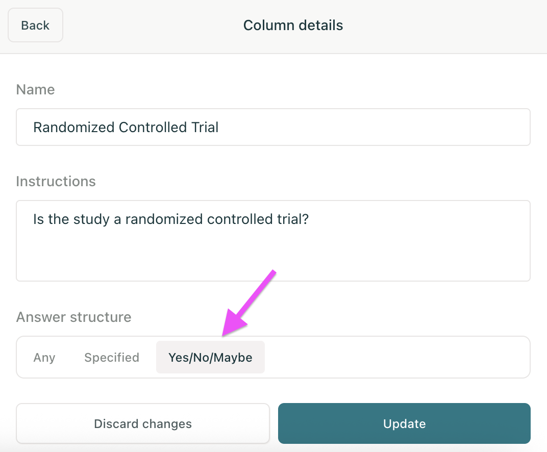 Use the Yes/No/Maybe option to create columns to answer yes or no questions about the papers in your table. These columns are great for screening papers to include in systematic reviews or to weed out papers that don't meet your specific research criteria.