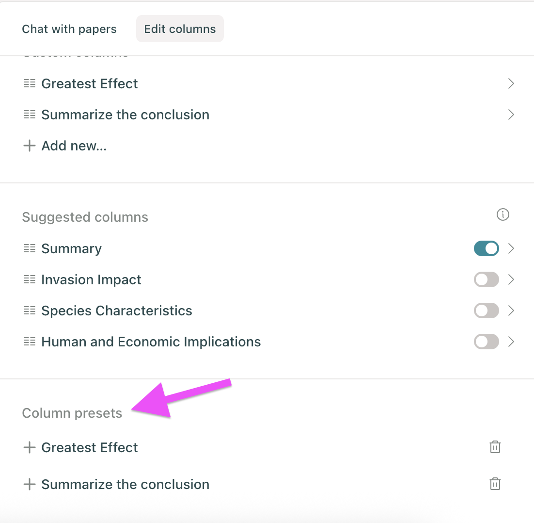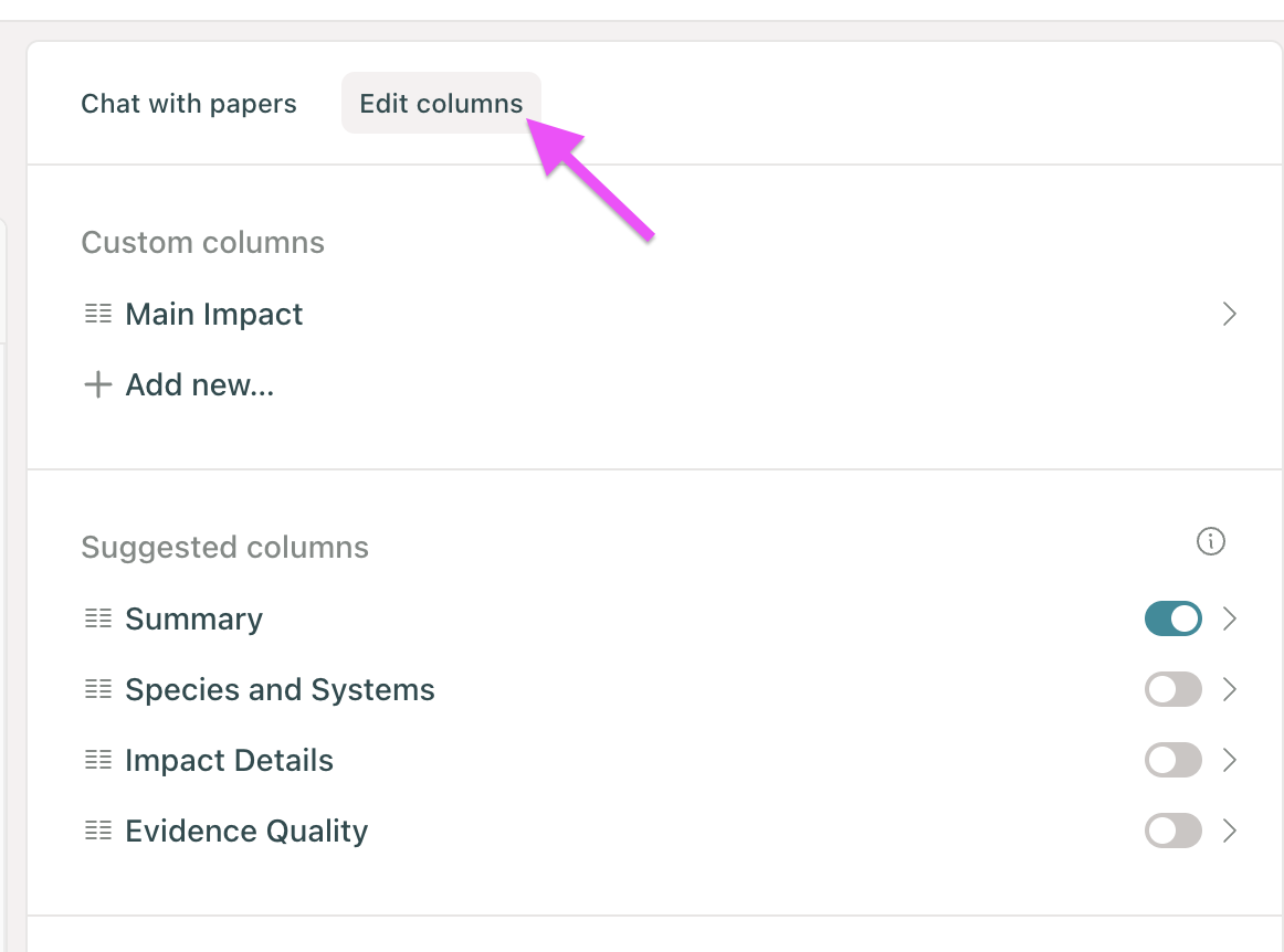 Elicit will suggest columns based on your research question. To view and add suggested columns, click the Edit Columns tab next to the Chat with Papers tab on the right sidebar: