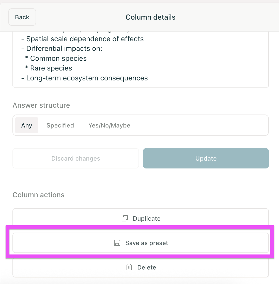 To save a column as a preset column, click the arrow next to the column to edit it. Then click the Save as Preset button: